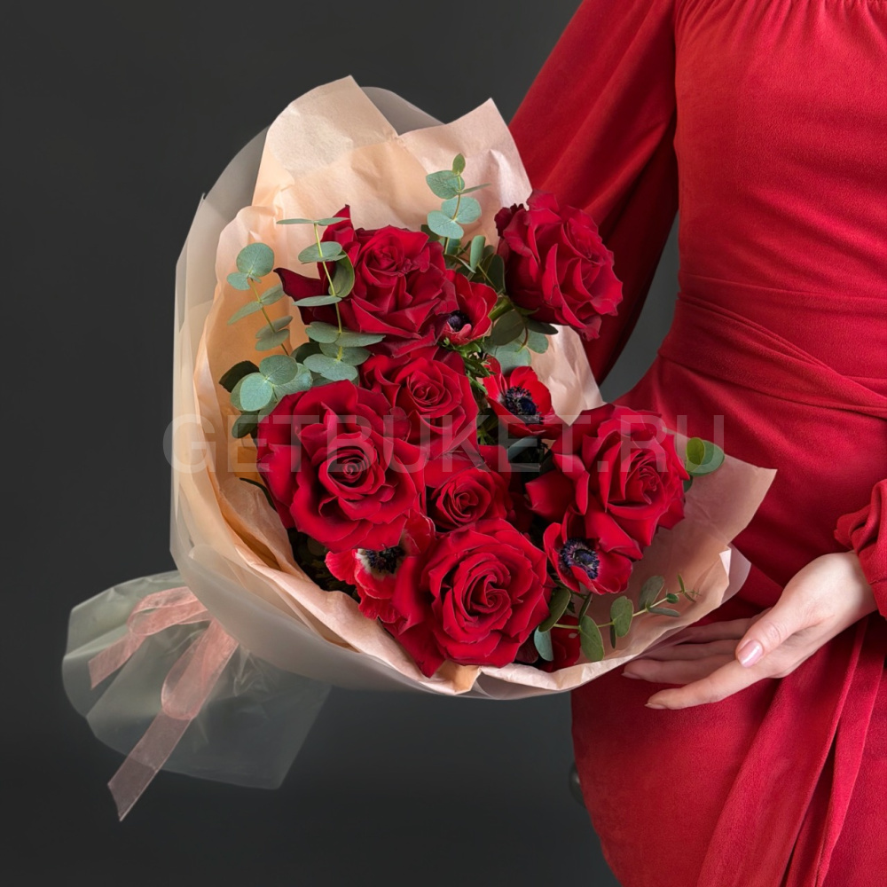 Красный букет роз с анемоном и эвкалиптом