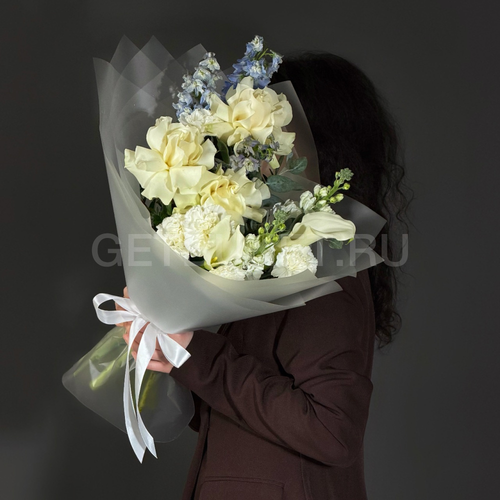 Букет из белых роз с дельфиниумом, гвоздикой и маттиолой