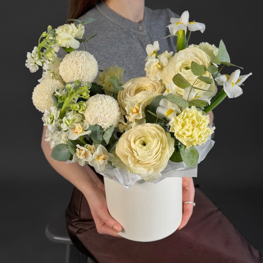 Цветочная композиция из ранункулюсов, ирисов и нарциссов в шляпной коробке