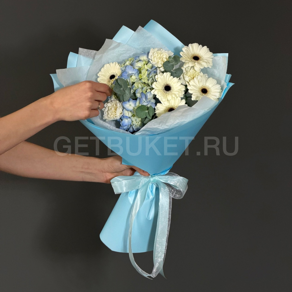 Букет из гербер, гортензии и эвкалипта